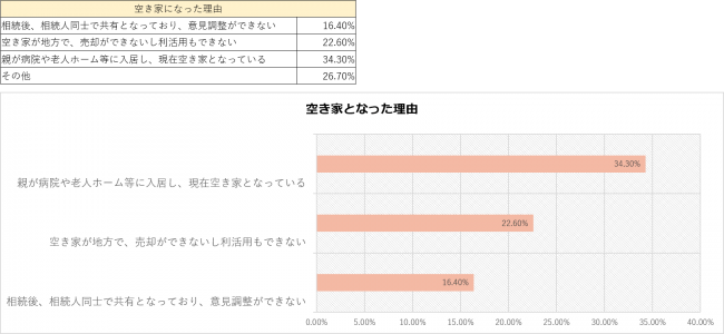 また、セミナー・イベントの参加者や個別相談者の年齢層としては、50代が29%、60代32%、となっており、50代60代が半数を超えた。セミナー・イベントの参加者にアンケートを実施したところ、現在空き家になった理由としての1位は、親が病院や老人ホーム等に入居し、現在空き家となっているの34.3%、2位は空き家が地方で、売却ができないし利活用もできない22.6%。3位は、相続後、相続人同士で共有となっており、意見調整ができないの16.4%。という結果になった。
