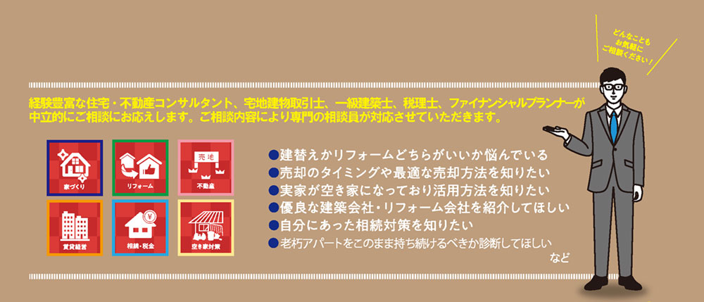 経験豊富な税理士、司法書士、不動産鑑定士、一級建築士、宅地建物取引士、ファイナンシャルプランナーが中立的にご相談にお応えします。ご相談内容により専門の相談員が対応させていただきます。