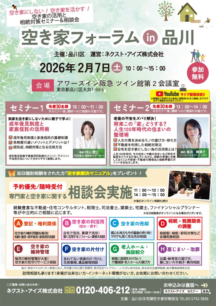 | 2/7(土) 10:00~15:00 個別相談会 | 専門家と空き家に関する相談会実施! ※当日個別相談をされた方に「空き家解決マニュアル」プレゼント! 時間:①11:00~13:00 ②14:00~15:00 ※予約優先。随時受付中 経験豊富な不動産・住宅コンサルタント、税理士、司法書士、弁護士、建築士、宅建士、ファイナンシャルプランナー等が中立的にご相談に応じます。※当日相談員がオンラインになる場合がございます。 A 法務・権利関係 空き家の相続問題、借地・立退き相談 B 空き家の利活用(住む・貸す) 自宅で活用、賃貸で活用!賢く活用するリフォーム・建替え相談 C 空き家の売却 都心も地方も今が最後の売り時!1円でも高く売る売却相談 D 相続・税務関係の調整 相続税・納税・節税対策など各種税務相談 E 空き家の維持管理 毎月の維持管理が大変!空き家の見守りサービス相談 F 空き家の片付け あわてない実家の片づけと、生前整理、遺品整理相談 G 老人ホーム・施設紹介 家族に迷惑をかけない!介護施設・老人ホームの選び方 H 墓じまい・改葬 お墓・納骨堂の選び方、墓じまいの手続き・費用相談 |