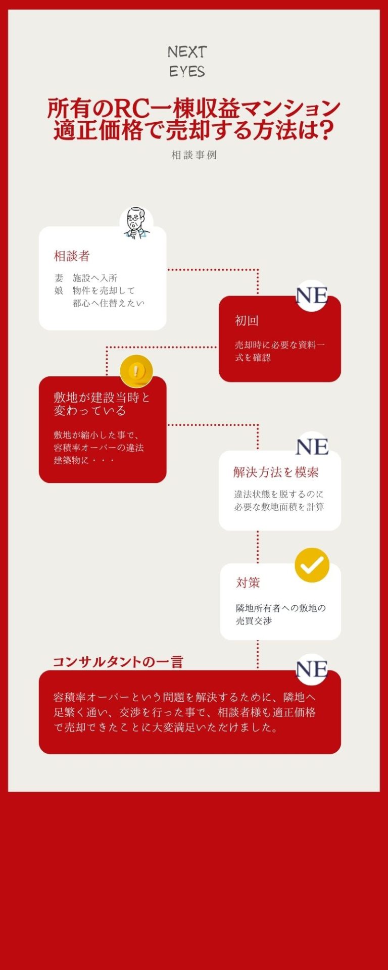 賃貸マンションの所有者は、容積率オーバーによる違法建築状態を解消した事により、適正な価格で物件を売却する事が出来た。