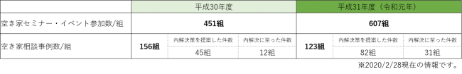 増加に至った背景としては、セミナー時に税理士、司法書士、行政書士、宅建士、FPなどの専門家相談窓口以外に空き家サービス関連事業者である、老人ホームなどの施設紹介、空き家の維持管理サービス会社、実家の片づけ相談会社などの窓口を増やし、一般消費者の皆さまが相談しやすい体制をとったことが解決の増加に至ったものと考えられる。