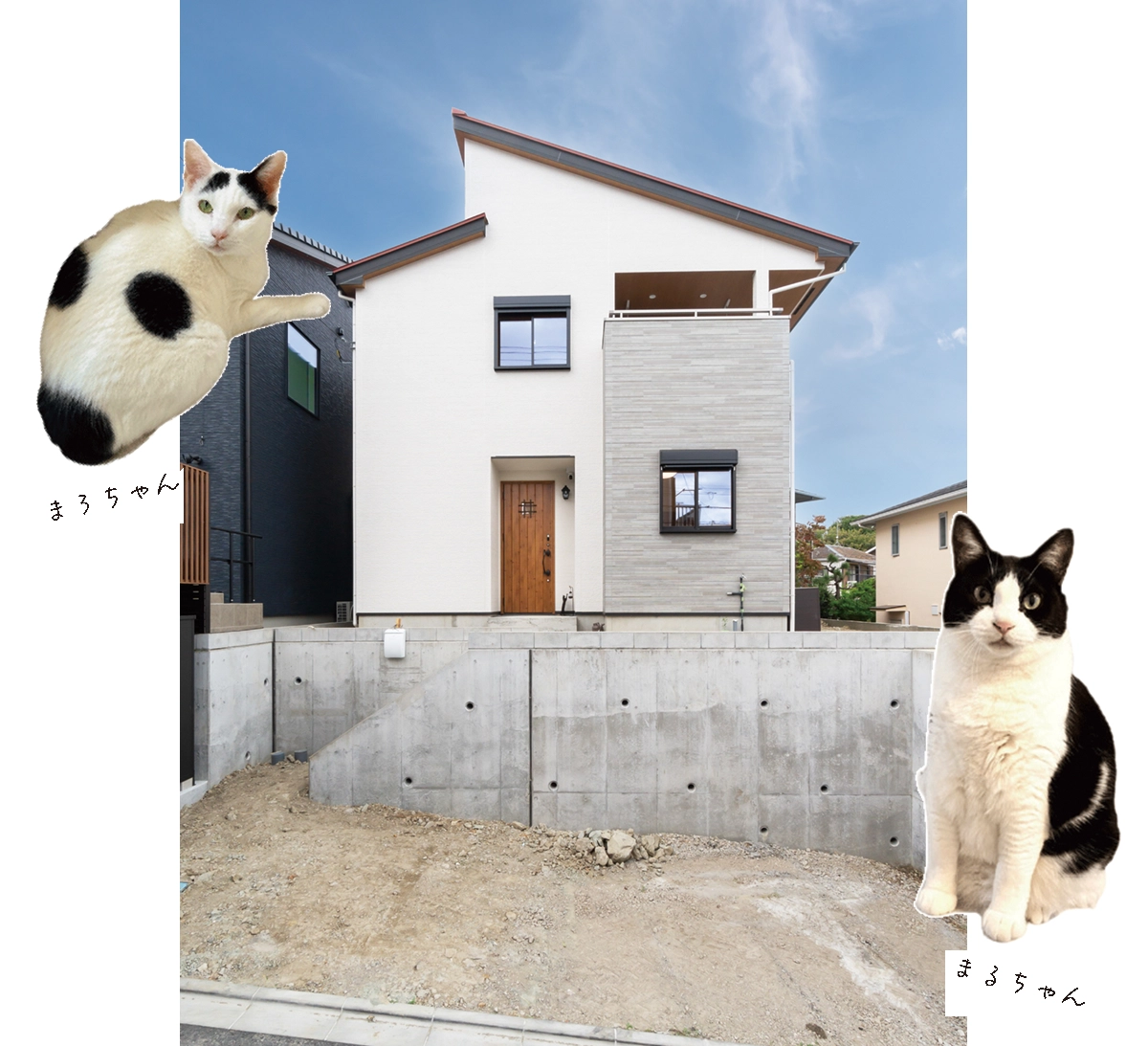 写真:M 様のアイドル、猫兄弟!まろちゃんとまるちゃん。静かな住宅街の一角に建つM様邸。年中快適な家を目指し、太陽光パネル、蓄電池、断熱建材の使用による各種助成金制度も上手に活用。