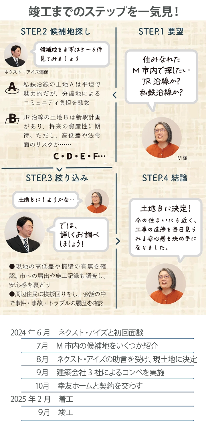M様 「やはり現地と周辺の雰囲気を見るのは大事。いい条件でも安い土地には理由があるものですね。何件も見るうちに、土地は価格相応だということがよくわかりました。」