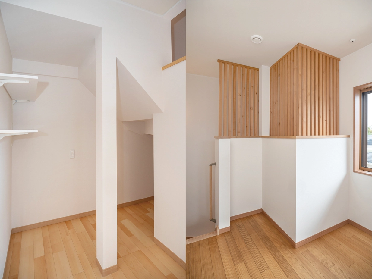 下右は階段上部の腰壁に設置した転落防止の柵。