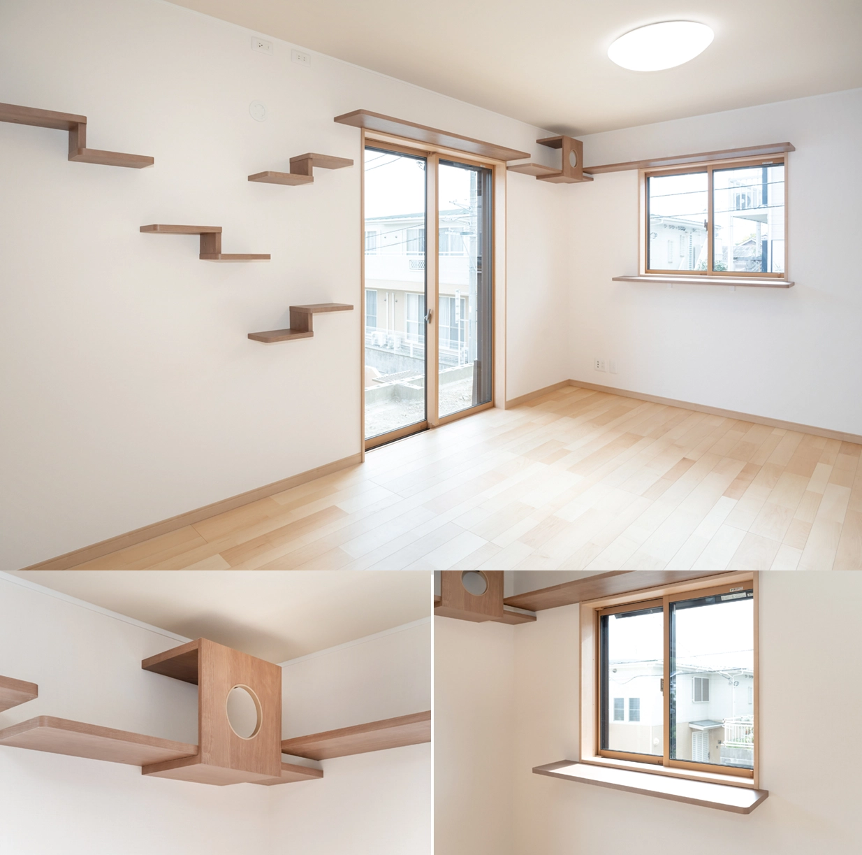 窓の下には、外を眺められる猫のためのまったりスペースも。